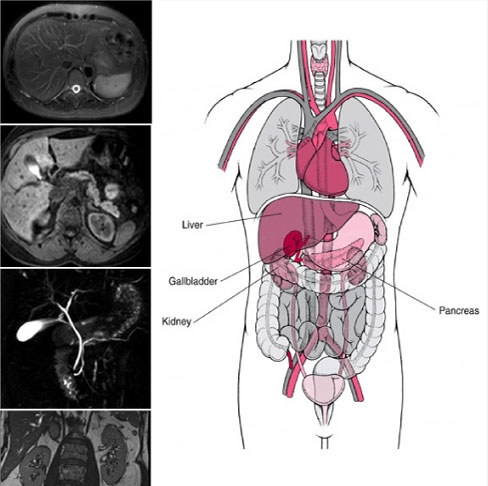 Abdominal magnetic resonance imaging (MRI) is a noninvasive procedure that uses powerful magnets and radio waves to produce pictures of the inside of the abdomen without exposure to ionizing radiation (x-rays).